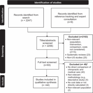 studies were included in the review, including 26 cohort studies, 17 cost studies and 1 randomized controlled trial. All included studies were rated as high or acceptable quality. Spinal pain patients who consulted chiropractors as first providers needed fewer opioid prescriptions, surgeries, hospitalizations, emergency department visits, specialist referrals and injection procedures.
